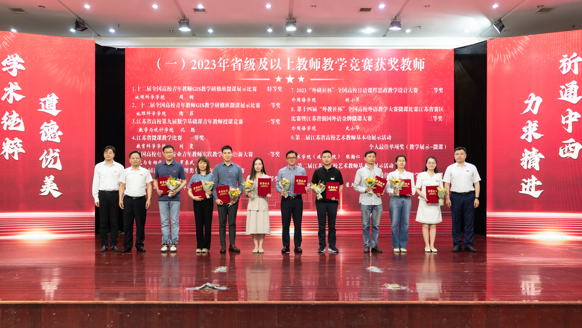 会上对第二批国家一流本科课程获奖者、2023年新增教育部和工信部平台及指导学生竞赛获奖者、2023年获得省级以上教师教学竞赛获奖者、2023年江苏省普通高等学校优秀本科毕业论文(设计)一等奖和优秀本科毕业论文(设计)团队奖获奖者、2023年获得省级荣誉教学管理人员进行了表彰,为2023年离开教学管理岗位的教师颁发荣誉证书,为增补本科教学督导发放聘书。