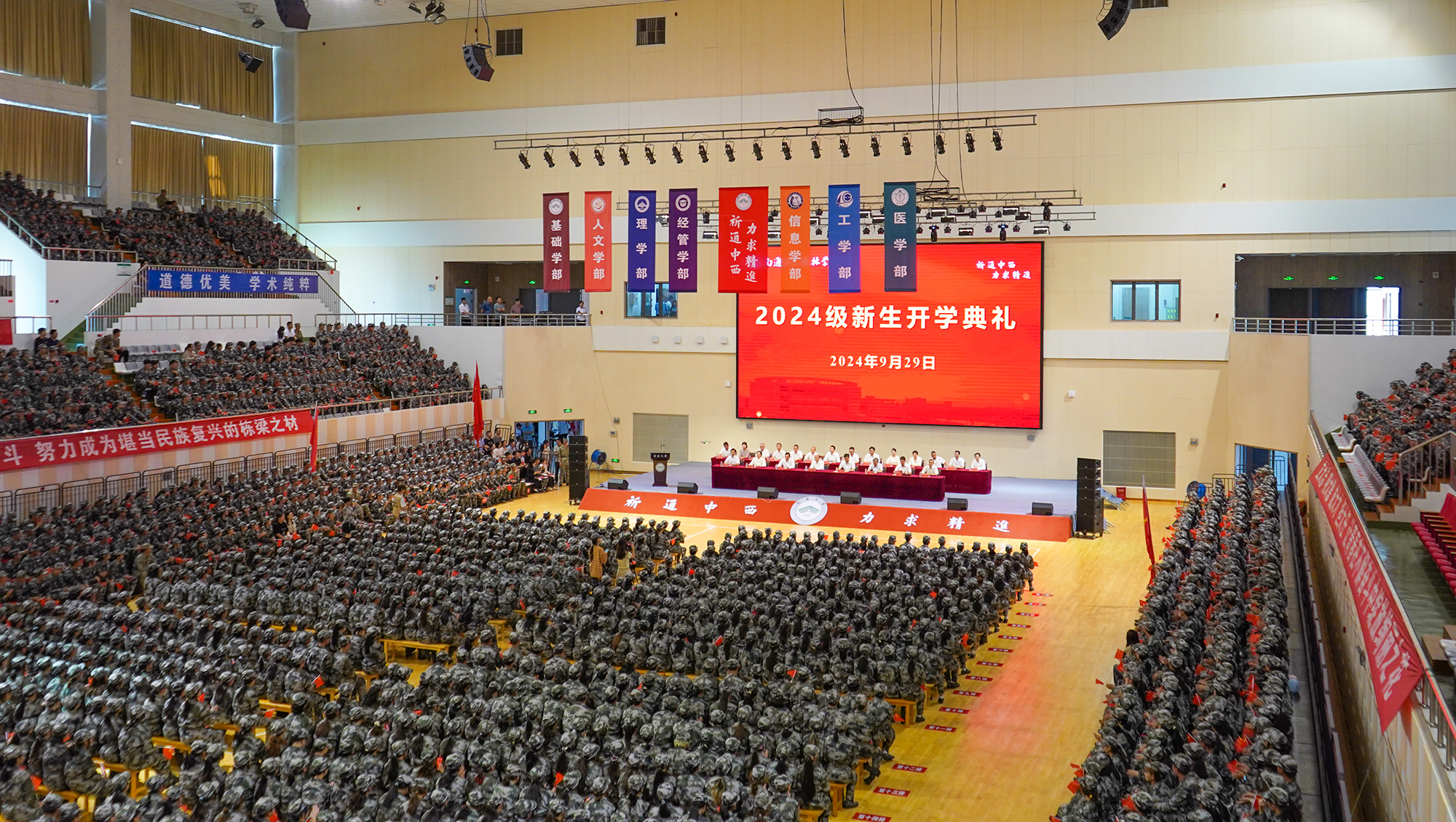 典礼在庄严的国歌声中拉开帷幕。校党委副书记、校长杨宇民作了题为《青春逢盛世 奋斗正当时》的讲话。他代表mg冰球突破试玩和杏林学院向新生表示热烈欢迎,向辛勤培育学生的父母和老师致以崇高的敬意。他对同学们提出三点期望。一是心系家国,从校史文脉中坚定前进方向。要传承通大优良的爱国传统和深厚的家国情怀,将小我融入大我,将个人理想融入国家发展伟业,与国家发展同频共振,与民族复兴同向同行,在时代洪流中锚定人生航向,以永不懈怠的精神状态和一往无前的奋斗姿态书写出青春华章。二是潜心学习,在博学精进中汲取智慧力量。要在博学强识中夯实基础,脚踏实地、深耕细作,一步一个脚印,打牢扎实的基本功;在矢志创新中提升能力,敢为人先、敢于突破,以聪明才智贡献国家,以开拓进取服务社会;在投身实践中增长本领,知行合一、学以致用,用实际行动服务经济社会发展和广大人民群众,在祖国最需要的地方淬炼青春、茁壮成长。三是接续奋斗,在实干笃行中实现人生理想。要实学实干,脚踏实地、埋头苦干,在攀登知识高峰中追求卓越,在肩负时代重任时行胜于言,在真刀真枪的实干中成就一番事业。要以时不我待的紧迫感、奋发进取的精气神,在崭新的舞台上不断探索未来的无限可能,在投身强国建设、民族复兴的伟大实践中放飞青春梦想、书写精彩人生。