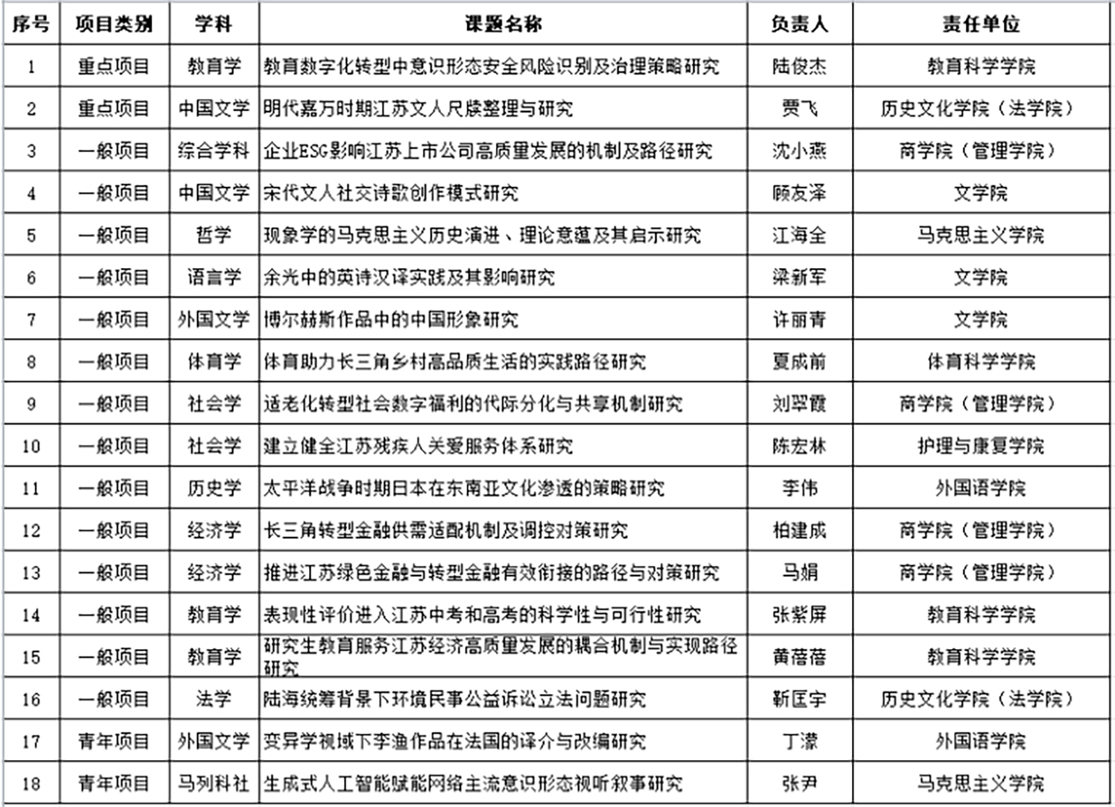 近日,江苏省哲学社会科学规划办公室公布2024年江苏省社科基金年度项目立项名单。mg冰球官网共有18个项目立项,与去年同期相比增长50%,其中重点项目2项、一般项目14项、青年项目2项。年度项目立项数位列全省第六位。
