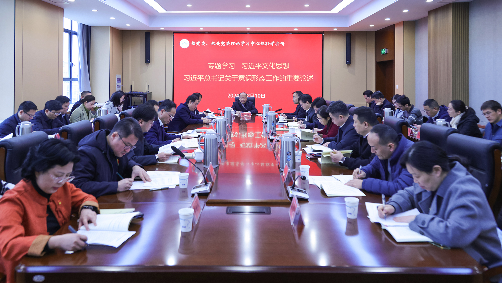 此次理论学习中心组专题学习会以校党委理论学习中心组与机关党委理论学习中心组联学共研的形式进行。校党委理论学习中心组、机关党委理论学习中心组全体成员参加学习会。