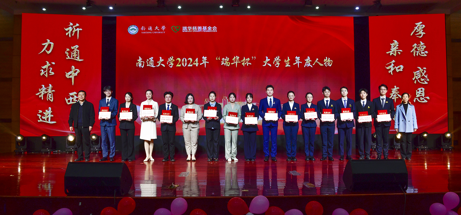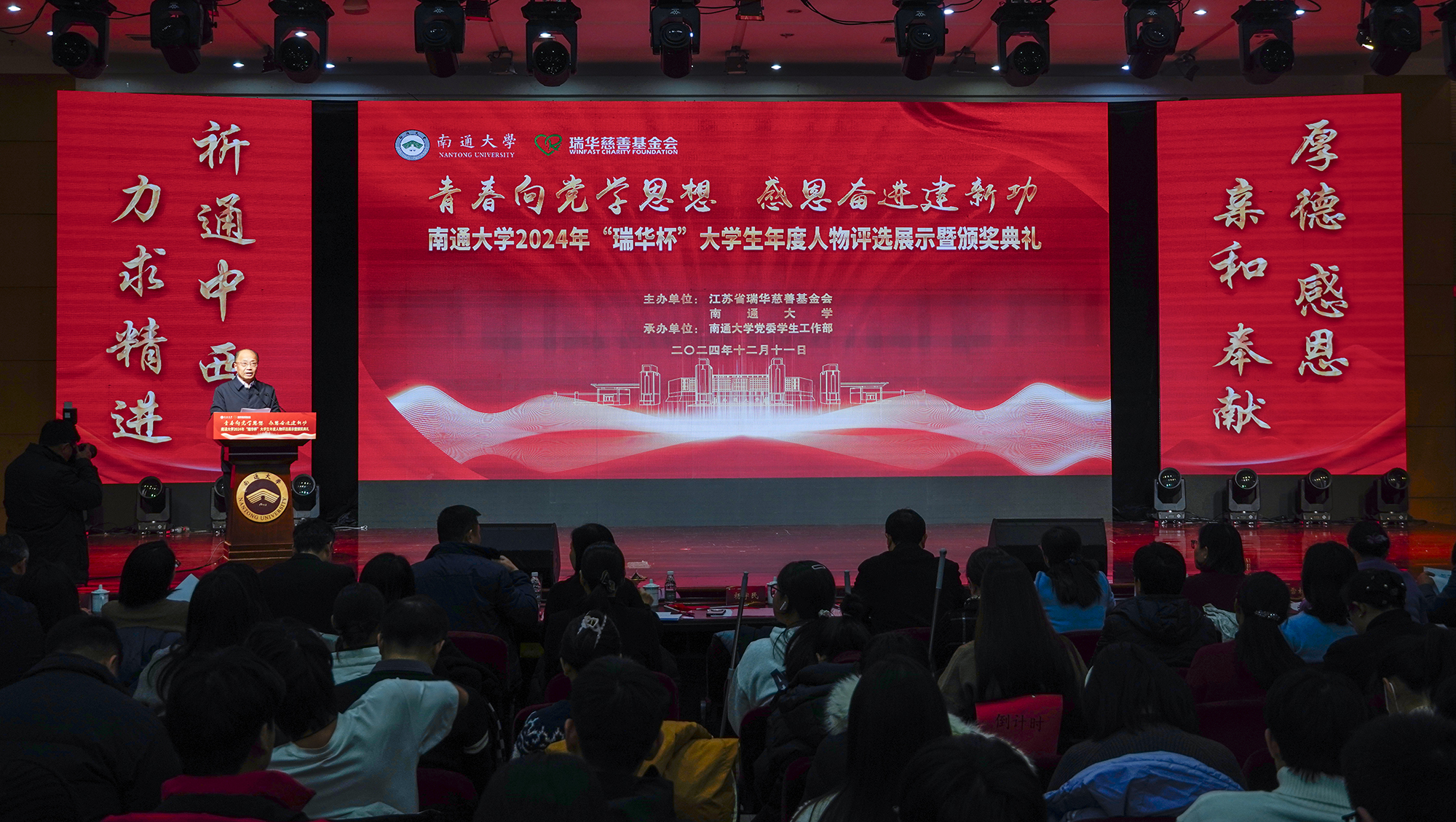 12月11日下午,mg冰球官网举办2024年“瑞华杯”大学生年度人物评选展示暨颁奖典礼。校党委副书记、校长杨宇民出席活动并讲话。江苏省瑞华慈善基金会执行理事长史兆荣,校党委常委、副校长莫晨宇为获奖同学颁发荣誉证书和奖学金。