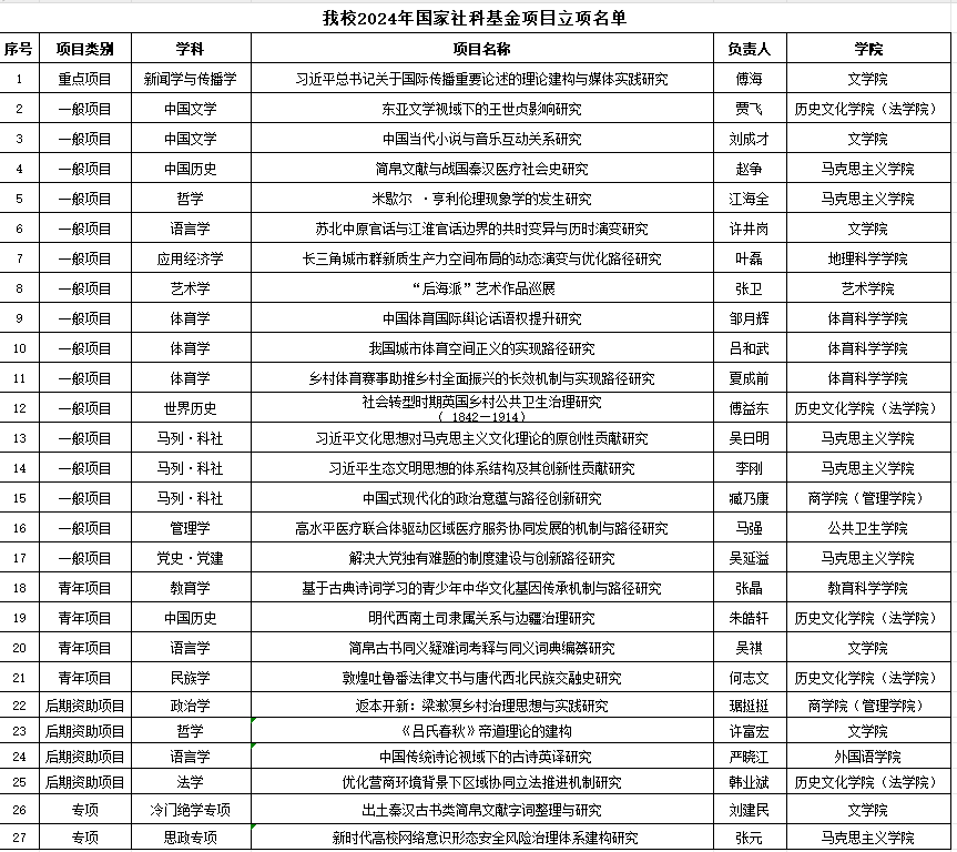 从学科分布看,马列·科社、语言学、体育学各3项,哲学、中国历史、中国文学各2项,党史·党建、法学、管理学、教育学、民族学、世界历史、新闻学与传播学、艺术学、应用经济学、政治学、冷门绝学及思政专项各1项。传统优势学科表现突出。从学院分布看,文学院、马克思主义学院各6项,历史文化学院(法学院)5项,体育科学学院3项,商学院(管理学院)2项,教育科学学院、外国语学院、艺术学院、公共卫生学院、地理科学学院各1项。文学院、历史文化学院(法学院)、马克思主义学院、体育科学学院成绩斐然。