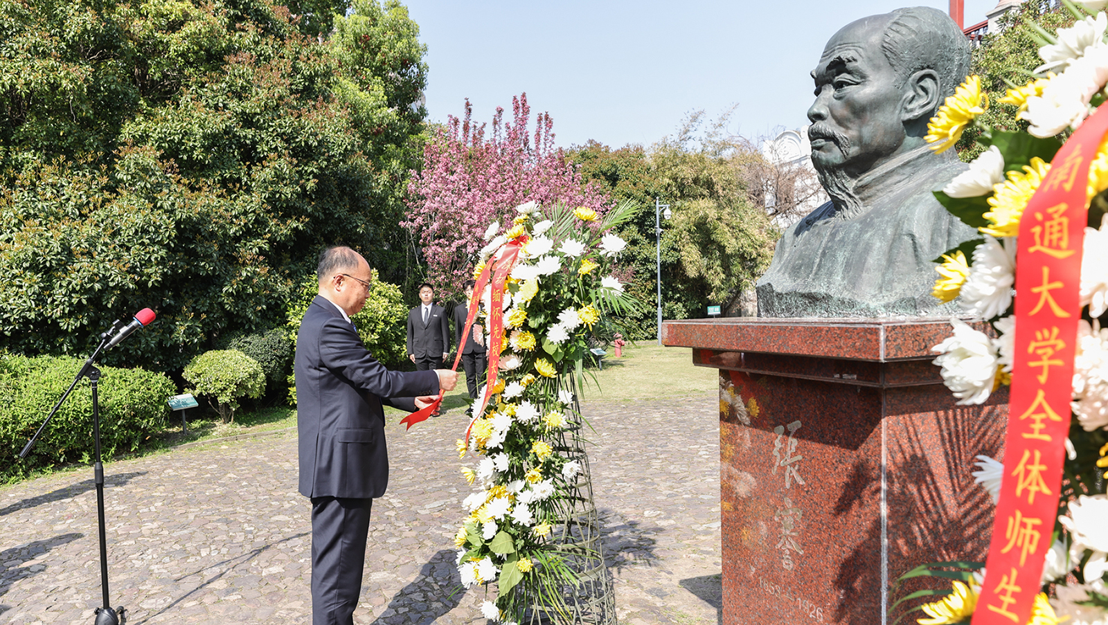 杨宇民在讲话中指出,追思回顾张謇先生兴学办校的曲折历史,传承学习他伟大的爱国主义精神,对全校上下凝心聚力、感恩奋进,推动学校事业高质量发展有着非常重要的意义。他强调,一要学习先校长张謇先生经世济民的爱国情怀,把个人“小我”融入国家“大我”,将个人奋斗融入学校发展,让深厚的爱国情怀成为通大人最鲜明的精神底色;二要学习先校长张謇先生敢为人先的开拓精神,打破守成思维,跳出“舒适区”、勇蹚“深水区”、敢闯“无人区”,在人才培养、学科建设、科学研究、社会服务等领域勇攀高峰,不断塑造发展新动能新优势,坚定不移走出一条具有通大特色的高质量发展之路;三要学习先校长张謇先生为民兴教的教育初心,大力弘扬“祈通中西,力求精进”的校训精神、“学必期于用,用必适于地”的办学理念、“道德优美,学术纯粹”的价值追求,全面推进内涵建设,不断激发办学活力,培养堪当民族复兴重任的时代新人。他希望全校师生牢记习近平总书记的殷殷嘱托,传承弘扬先校长的爱国情怀和教育思想,把对先校长的缅怀与纪念化为干事创业的强大动力,凝心聚力,勇毅前行,全力推动学校各项事业高质量发展。