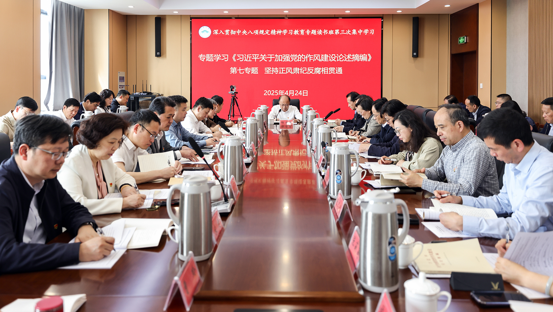4月24日,mg冰球官网举行深入贯彻中央八项规定精神学习教育专题读书班第三次集中学习,认真研学《习近平关于加强党的作风建设论述摘编》第七至第九专题。校党委书记、校长杨宇民主持学习会。全体在通校领导、党委常委参加学习。