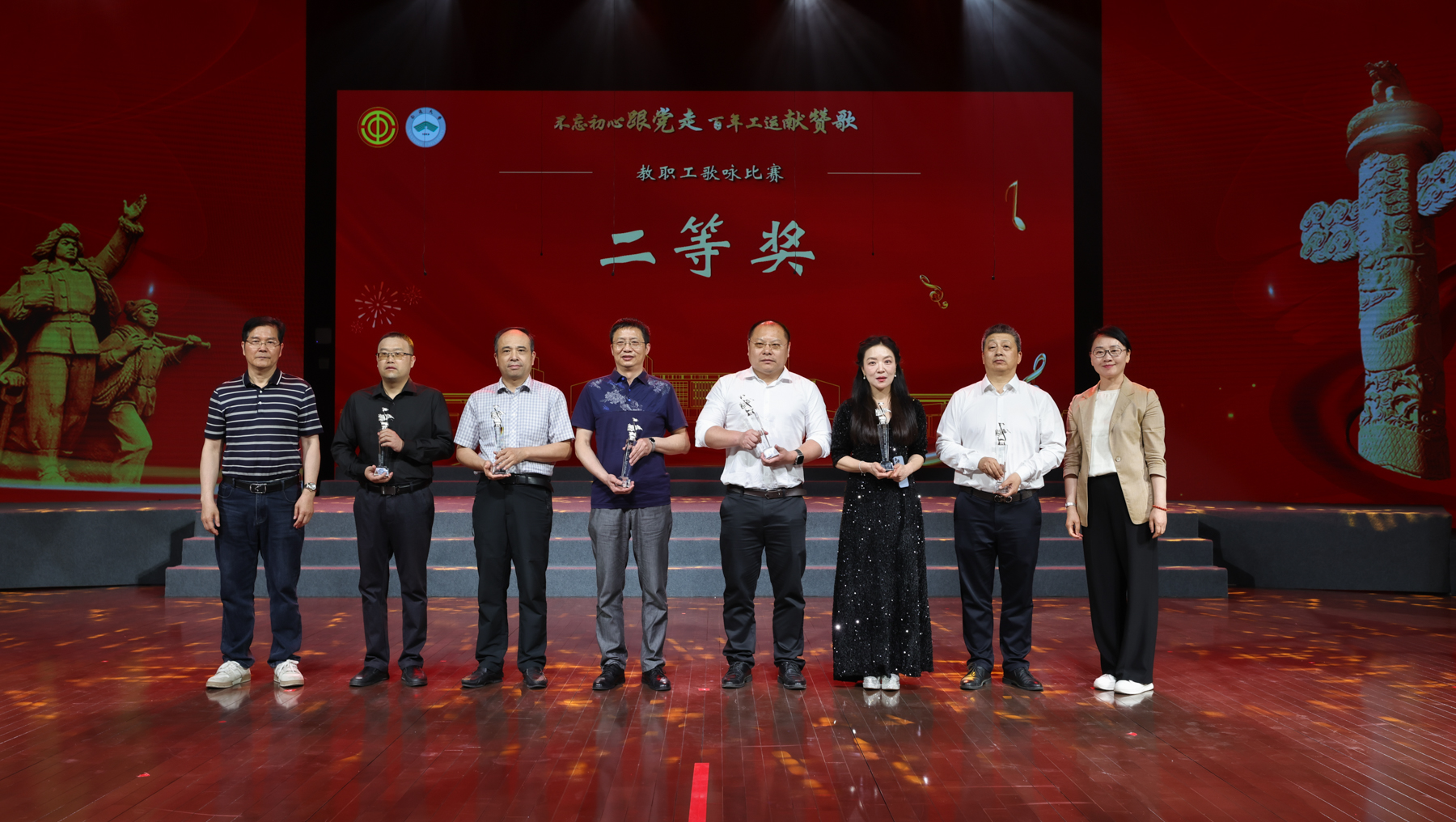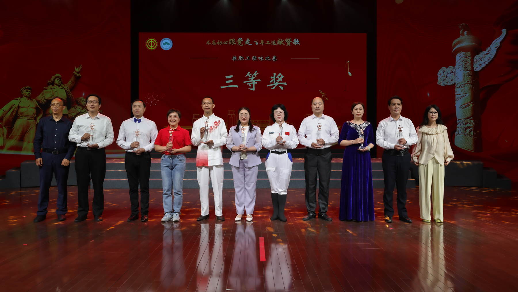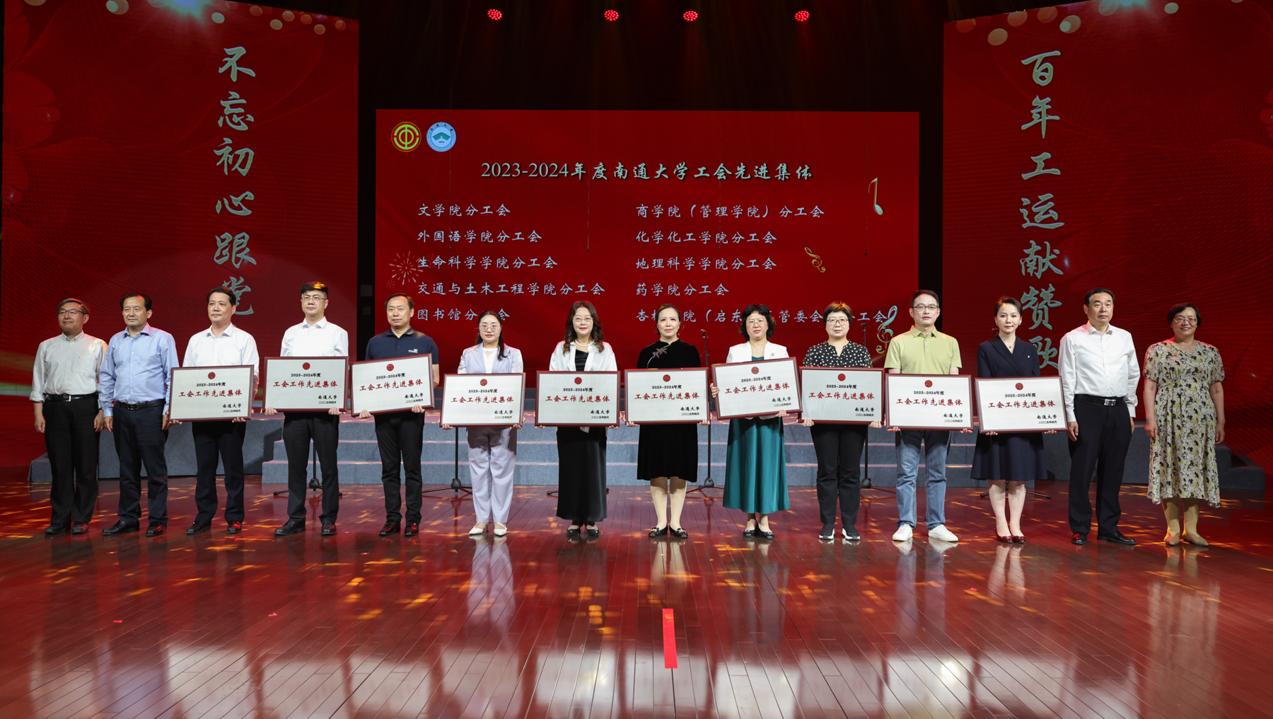 百年奋斗,薪火相传;百年荣光,再启新程。雄壮嘹亮的歌声响彻艺术中心剧场,27支代表队依次登场,分别唱响《走向复兴》《奉献》《江山》《打靶归来》《精忠报国》《祖国不会忘记》《我爱你,中国》《保卫黄河》《团结就是力量》等多首经典曲目。教职工们激情洋溢、放声高歌,用音符镌刻劳动荣光,用和声礼赞奋斗征程,流露出爱党爱国的深厚感情,展现了通大教职工昂扬向上的精神风貌。离退休教职工代表、艺术学院分工会还分别带来《再唱山歌给党听》《我和我的祖国》的精彩表演。经评委打分,机关、医学院、文学院代表队获一等奖;后勤保障部、生命科学学院、人工智能与计算机学院、外国语学院、信息化中心与继续教育学院、教育科学学院代表队获二等奖;杏林学院(启东校区管委会)、电气与自动化学院、体育科学学院(支云足球学院)、化学化工学院、交通与土木工程学院、机械工程学院、商学院(管理学院)、药学院、信息科学技术学院代表队获三等奖。南通市音乐家协会主席张辉、南通市教育工会主席周淑平等评委为获奖代表队颁奖。