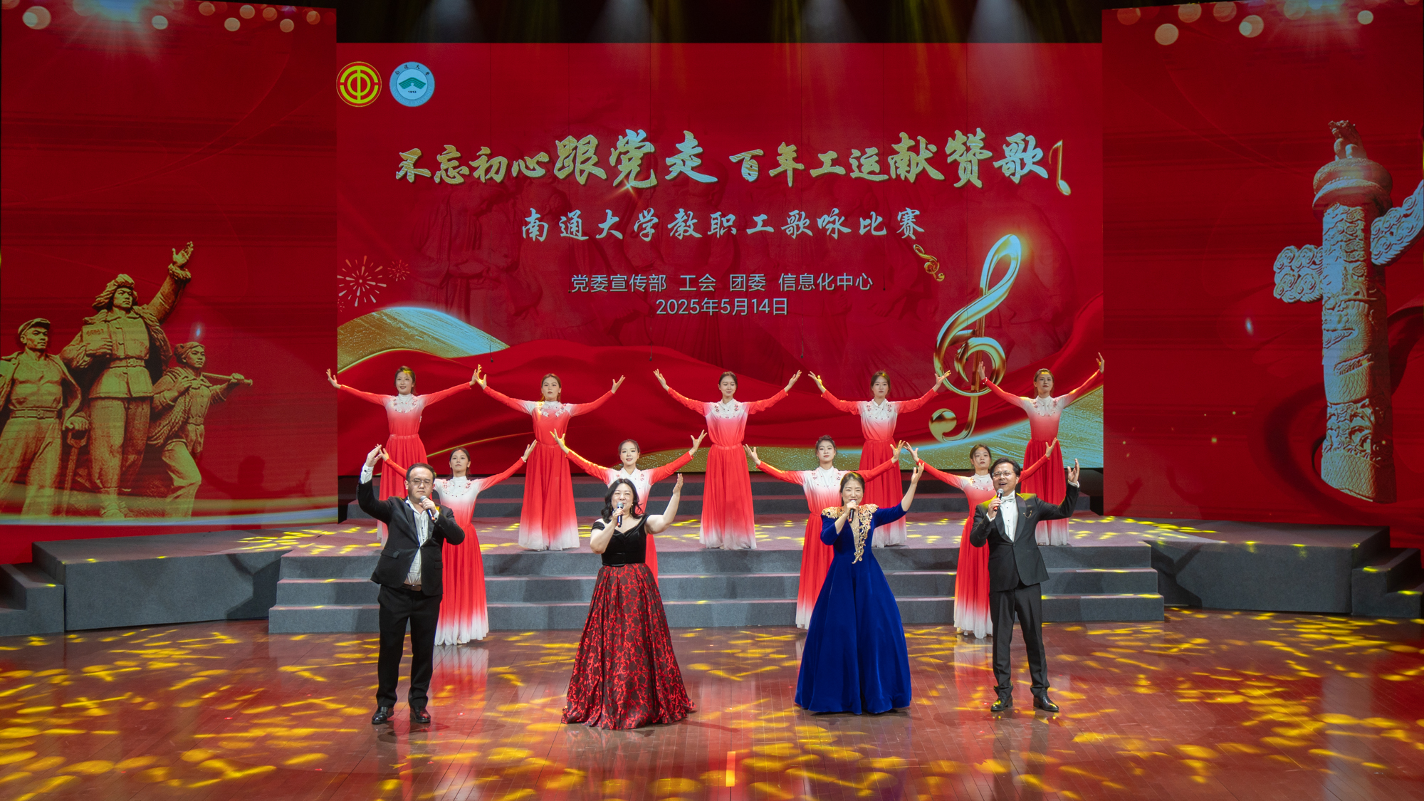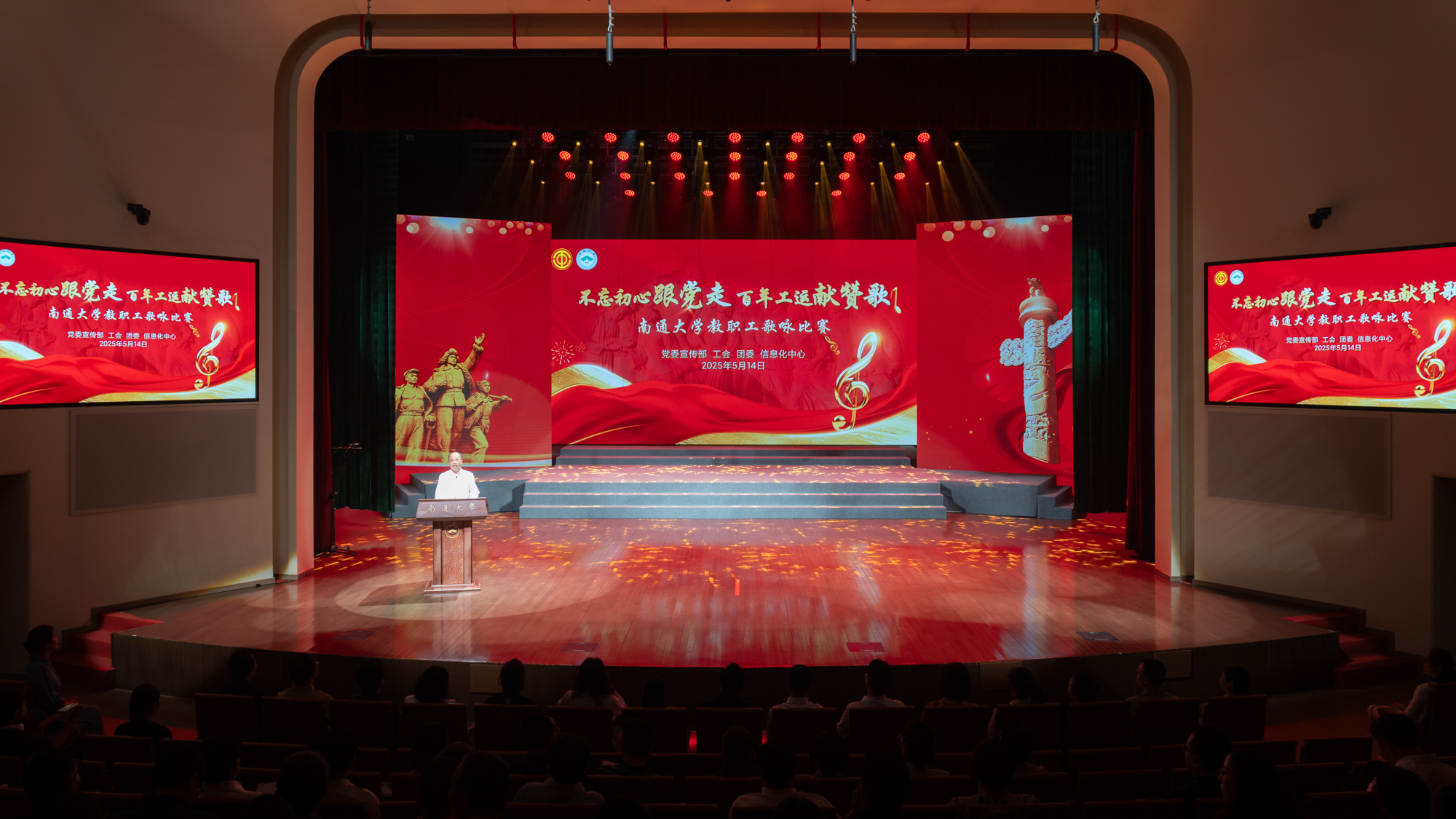 杨宇民代表校党委向比赛成功举办表示热烈祝贺,向积极参加比赛的各分工会和广大教职工致以诚挚的问候和崇高的敬意。他指出,百年工运史,是一部工人阶级听党话、跟党走的奋斗史,是一部工会组织与时代同频共振、与职工血肉相连的发展史。他表示,举办教职工歌咏比赛,既是对百年工运精神的传承弘扬,也是学校文化育人成果的生动展示,对于进一步凝聚全体教职工团结奋进的强大精神力量具有重要意义。他希望各参赛团队以饱满的激情、自信的状态,在舞台上绽放光芒,让歌声成为传承劳模精神的号角,成为抒发爱党爱国爱校情怀的心声,成为凝聚奋进力量的纽带,以更坚定的信念、更昂扬的姿态,在建设特色鲜明国内一流大学的新征程上续写通大新的辉煌。