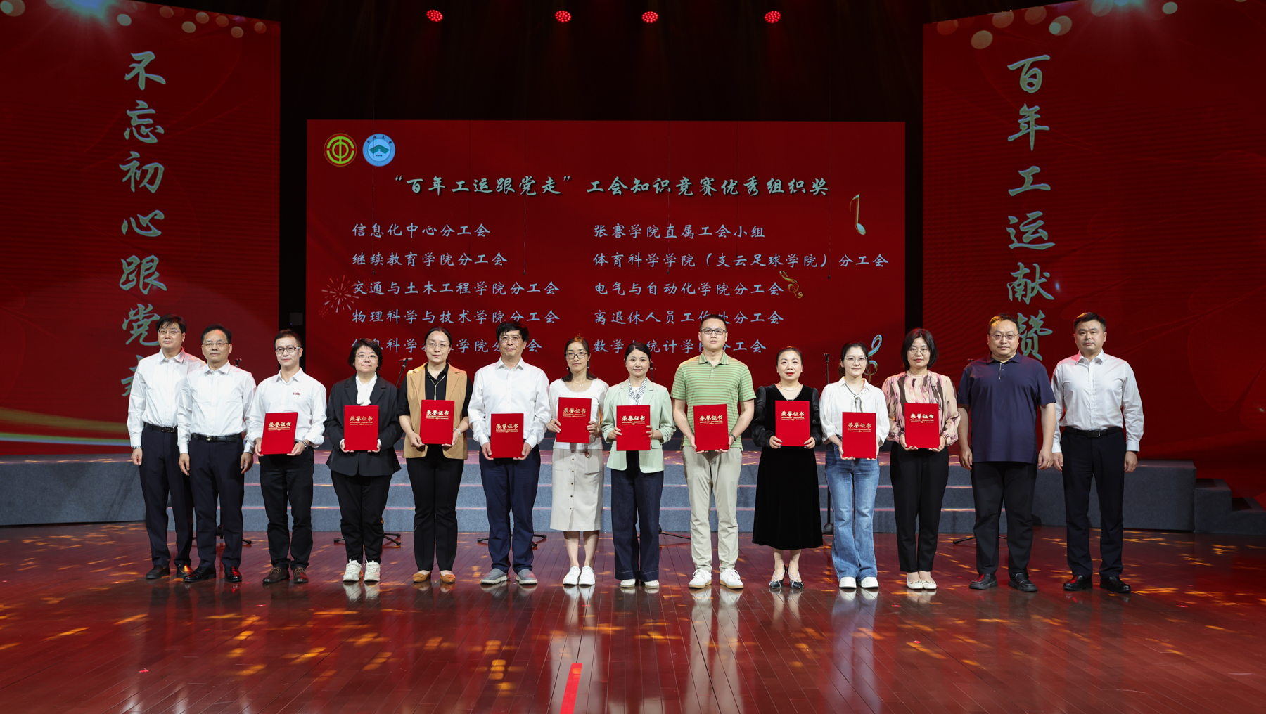 工会工作是学校事业发展的重要组成部分,mg冰球官网工会始终坚持以习近平新时代中国特色社会主义思想为指导,把广大教职工紧紧团结在校党委周围,围绕中心工作,服务发展大局,充分发挥桥梁纽带作用,在教职工思想引领、权益保障、文化建设等领域深耕细作。活动中,与会领导还为荣获2023—2024年度mg冰球突破试玩工会工作先进集体的10个分工会、荣获“百年工运跟党走”工会知识竞赛活动优秀组织奖的10个分工会、直属工会小组颁奖。