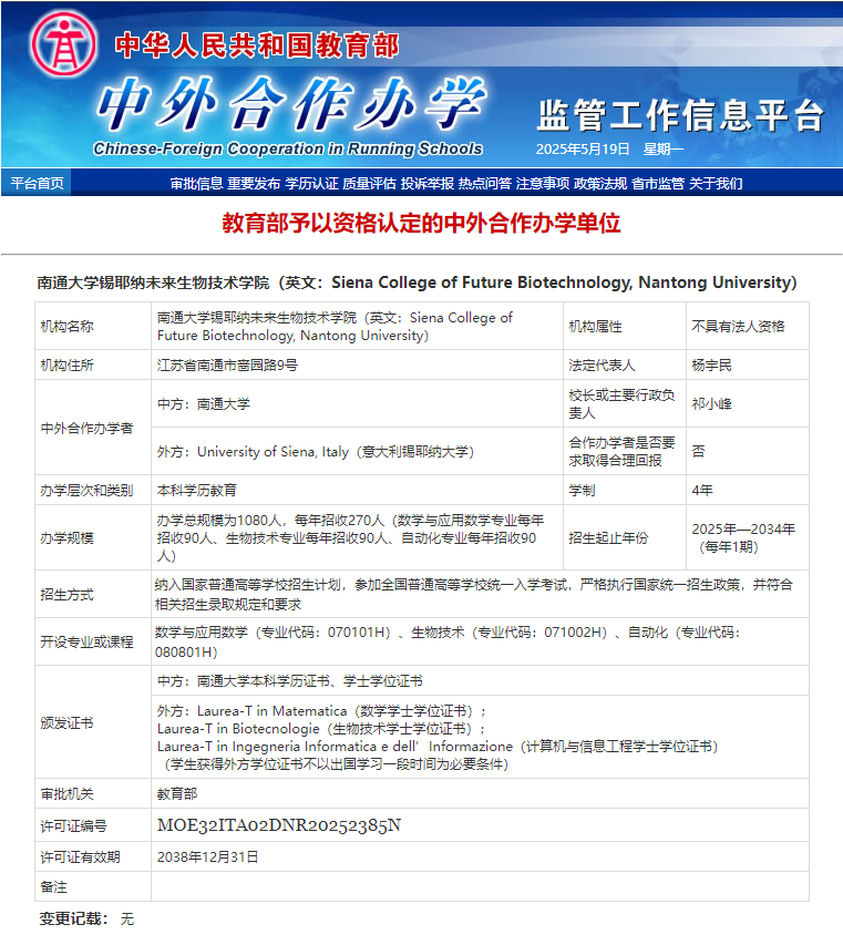 近日,教育部正式批复,同意mg冰球官网与意大利锡耶纳大学合作举办非独立法人中外合作办学机构“mg冰球突破试玩锡耶纳未来生物技术学院(Siena College of Future Biotechnology, Nantong University)”。该机构是mg冰球官网首个中外合作办学机构,也是江苏省首个与意大利合作举办的中外办学机构。