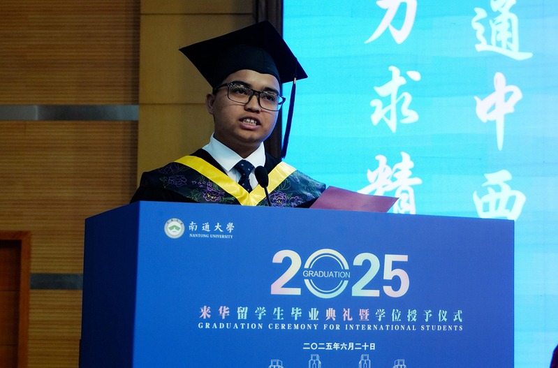 来自孟加拉国的人工智能与计算机学院计算机科学与技术专业的CHAKMA VASKAR作为来华留学本科毕业生代表发言。他用流利的中文,分享了在通大求学的心路历程,向学校、老师、家长和同学们表达真挚感谢。他表示,作为新时代的通大人,将带着通大的印记继续前行,为建设一个更加美好的世界而不懈努力。