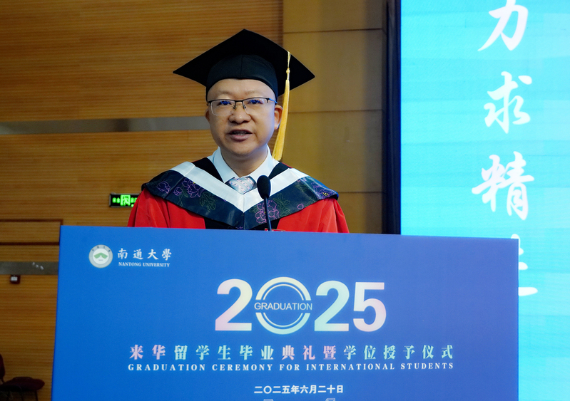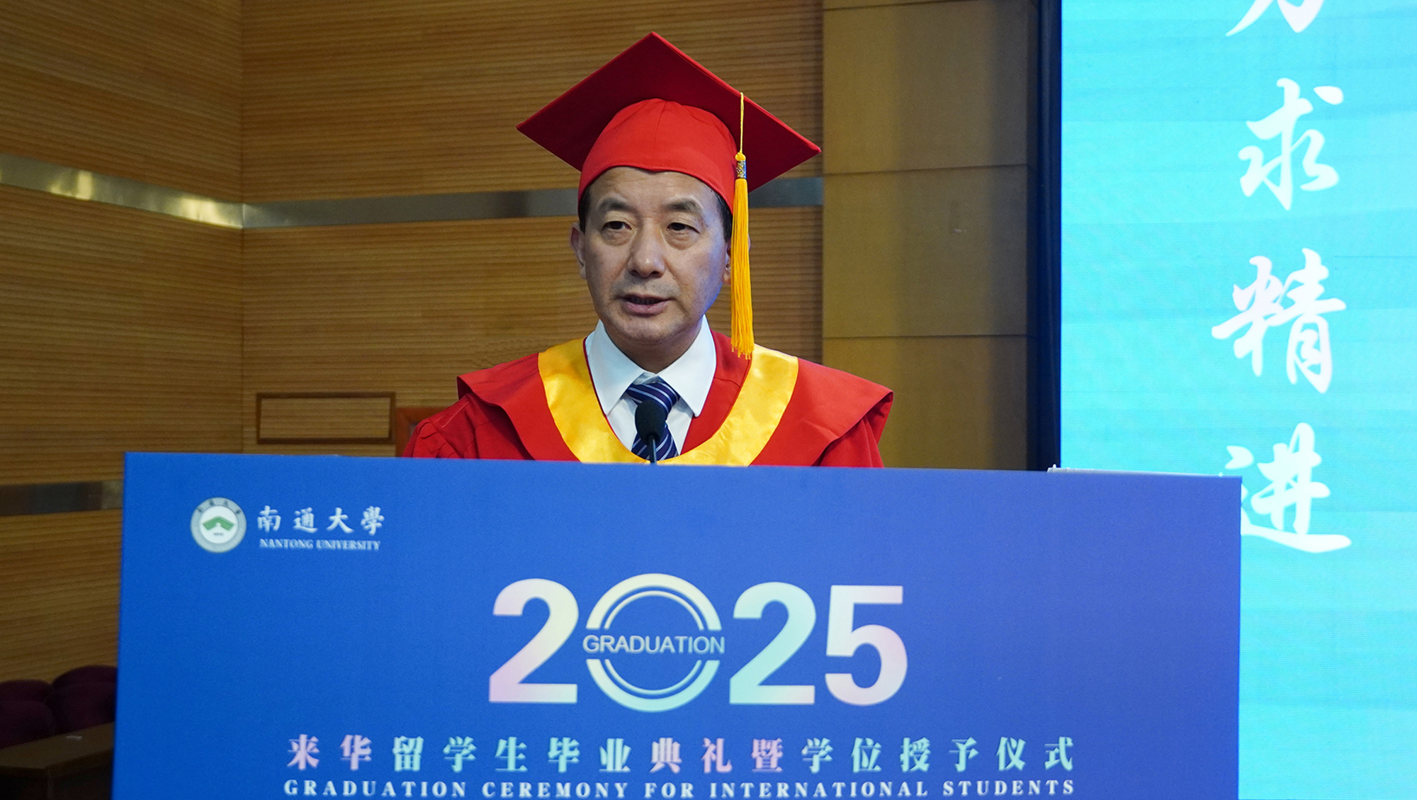 王卫东代表学校向2025届来华留学毕业生致以诚挚的祝贺,向辛勤培育来华留学生成长的师长表示感谢,向不远万里前来现场观礼的各国家长代表致以最热烈的欢迎。他对即将离开母校奔赴世界各地的毕业生们提出三点希望。一是希望毕业生们成为“各美其美,美美与共”的交流使者。在双向交流中促进文明互鉴,增进各国人民的理解与友谊,为构建人类命运共同体贡献力量。二是希望毕业生们成为“海纳百川,有容乃大”的践行者。在未来的学习或工作中,以开放心态拥抱多元文化,以包容胸怀尊重不同观点,在兼收并蓄中博采众长,积极投身国际合作舞台,努力成长为具有全球视野与国际竞争力的复合型人才。三是希望毕业生们成为“路漫漫其修远兮,吾将上下而求索”的探索者。树立终身学习的理念,以求知若渴的姿态,精进专业技能、拓宽综合素质,以知识为画笔共绘世界和平发展的蓝图;同时恪守品德修养,做有爱心、有责任、有担当的时代新人,让世界和平、共同发展的正能量遍布全球。