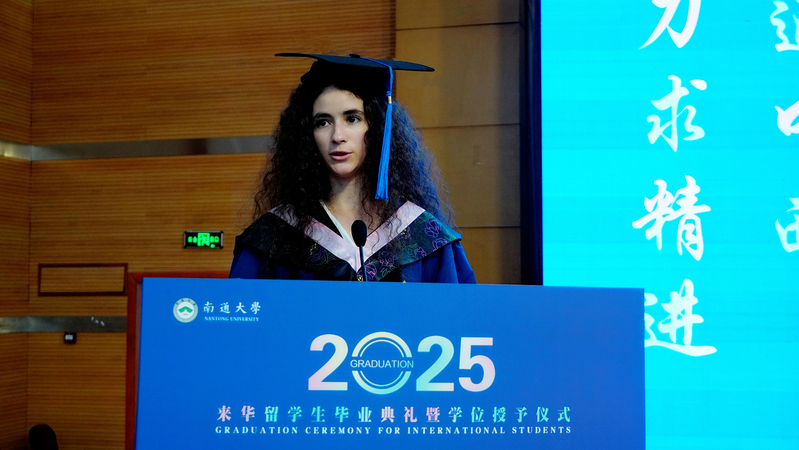 来自摩洛哥的商学院(管理学院)国际商务专业的JAADI KHAOULA作为来华留学研究生毕业生代表发言。她回顾了在通大学习生活的三年中学校、老师、同学们给予她的无私帮助,让她克服了思乡之情,感受到了“家”的温暖。她会继续心怀热爱、奔赴山海,做好中非商务的友好桥梁。