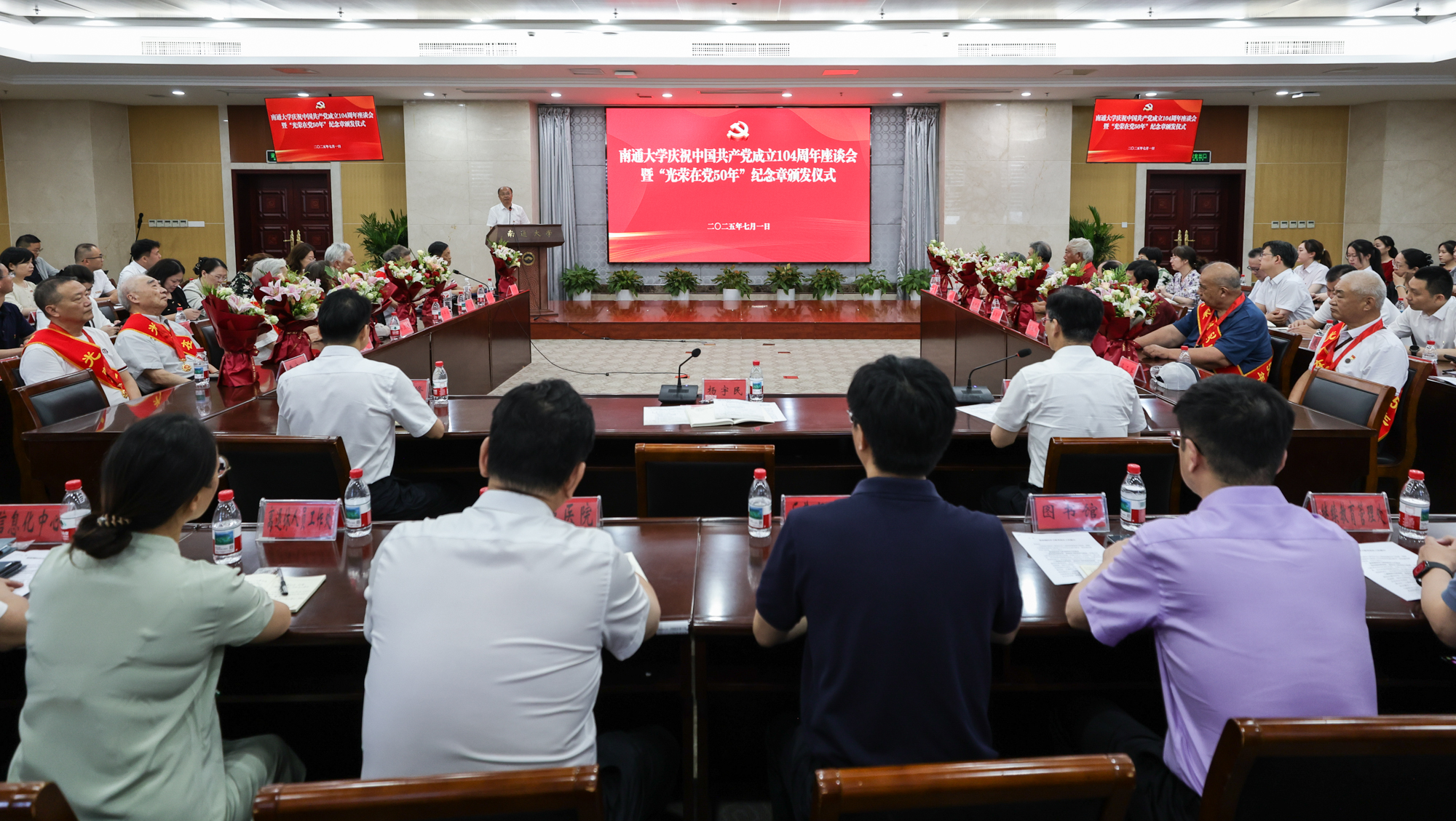 7月1日下午,mg冰球官网举行庆祝中国共产党成立104周年座谈会暨“光荣在党50年”纪念章颁发仪式。校党委书记杨宇民为14位老党员代表颁发“光荣在党50年”纪念章。校党委常委、纪委书记、派驻监察专员周振修带领全体党员重温入党誓词。校党委常委、党委组织部部长吴如高主持会议。