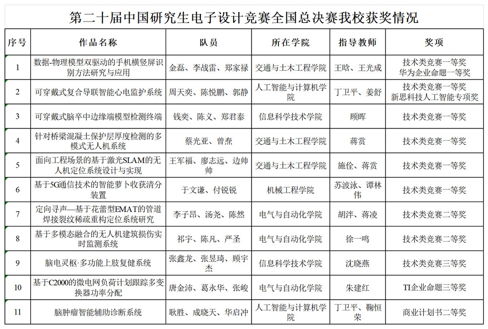 8月17日,第二十届中国研究生电子设计竞赛全国总决赛在深圳落幕。经过激烈角逐,mg冰球官网参赛作品荣获技术类竞赛全国一等奖6项、二等奖3项、三等奖2项。其中,首次获华为企业命题一等奖1项,首次获新思科技人工智能专项奖1项,该两项专项赛事全国获奖数均仅有2项,创下mg冰球官网在该赛事中的最佳战绩,实现mg冰球官网一等奖总数、专项赛事奖等历史性突破。我校再次荣获“优秀组织单位奖”,6位教师荣获“优秀指导教师”称号。