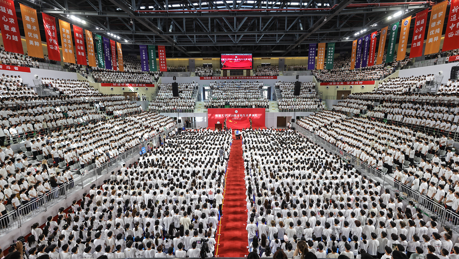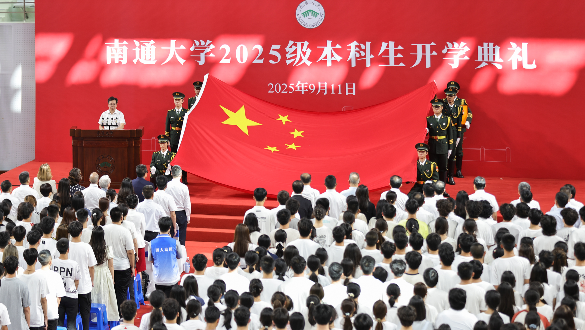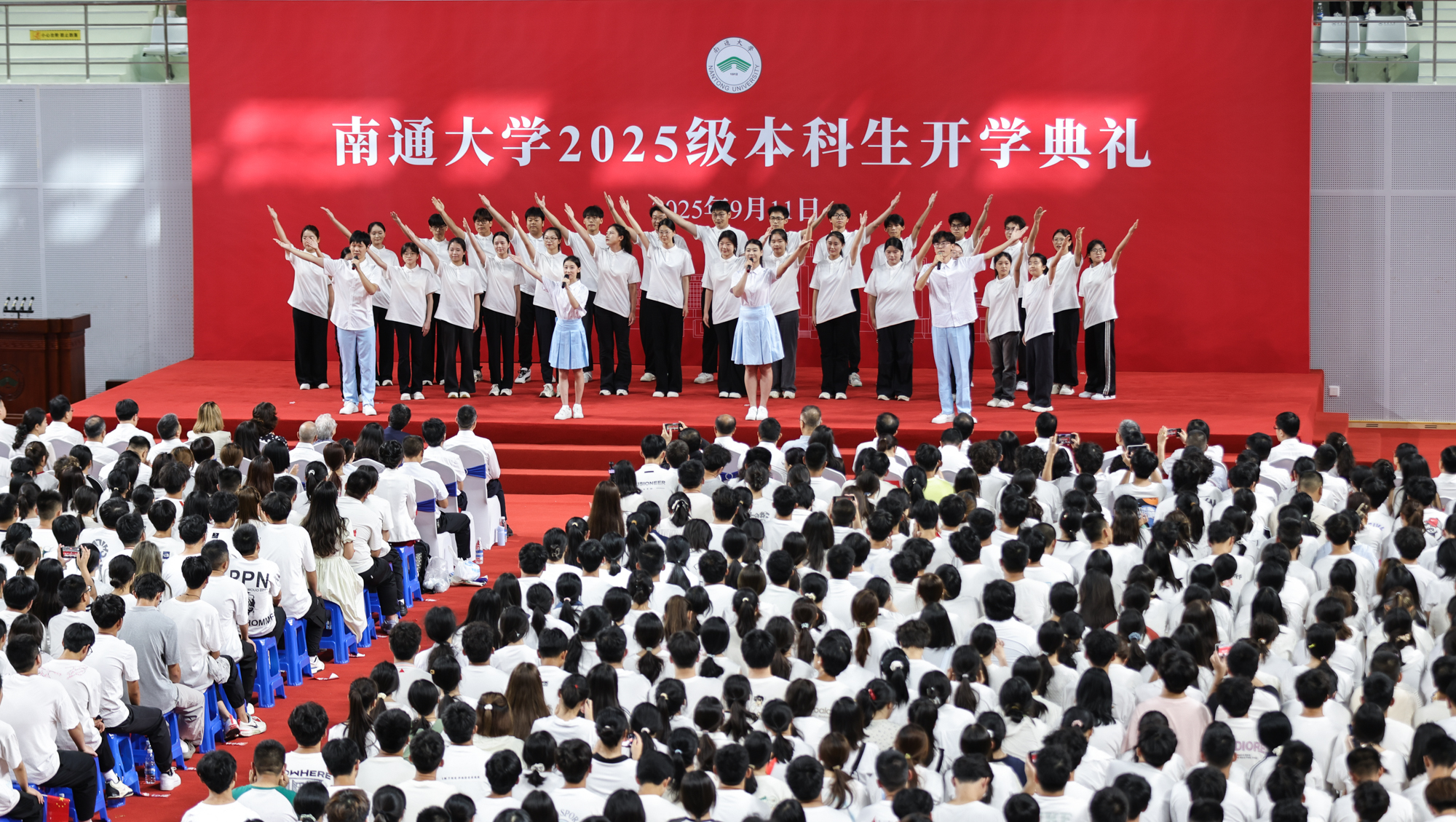 9月11日,mg冰球官网2025级本科生开学典礼分别在啬园校区、启东校区举行。两校区体育馆内师生满座,洋溢着青春的朝气。校党委书记杨宇民为新生代表佩戴校徽。校长王建浦在典礼上讲话。全体本科新生戴上校徽,正式成为一名通大人。