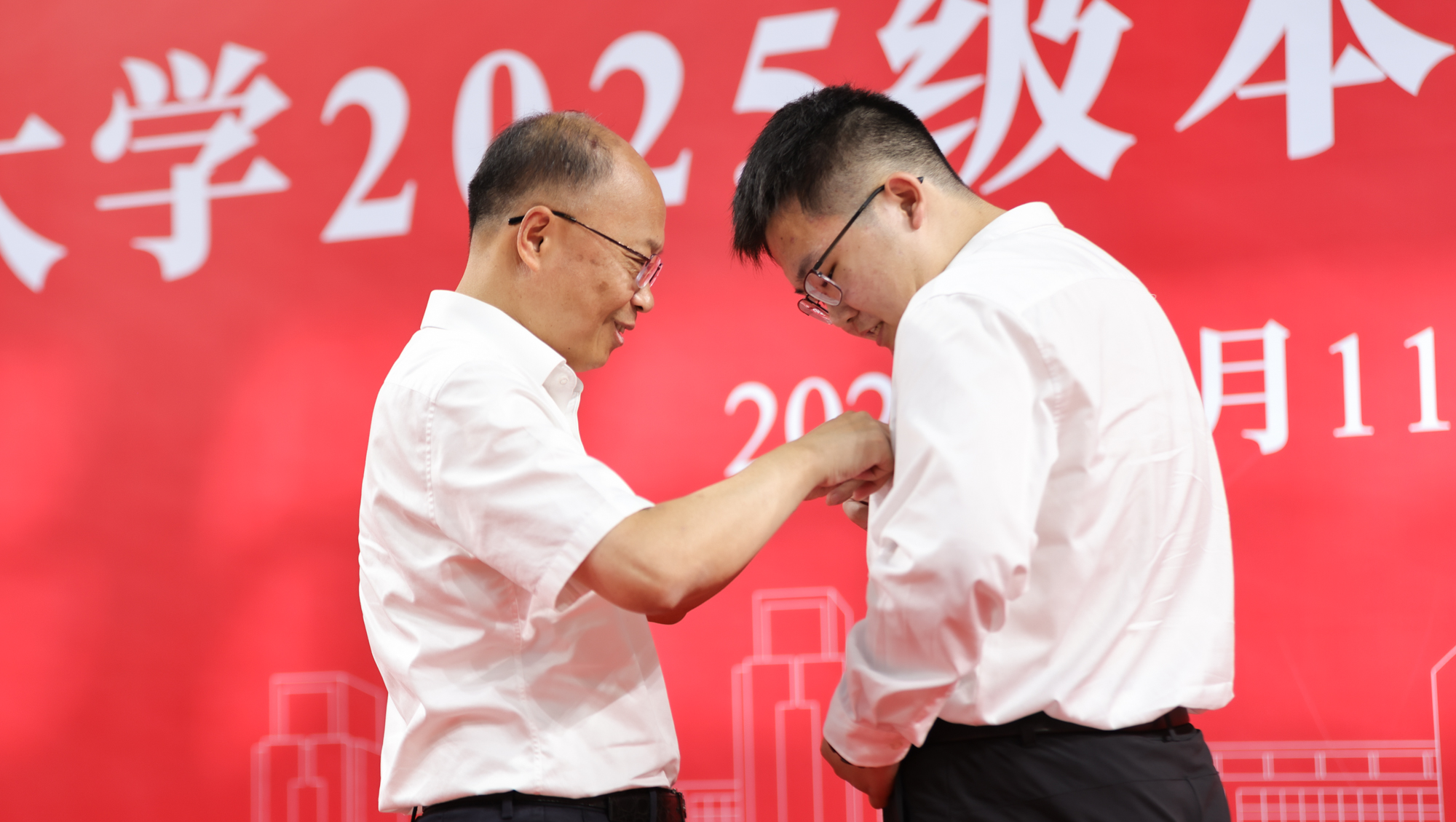 校党委书记杨宇民为新生代表佩戴校徽