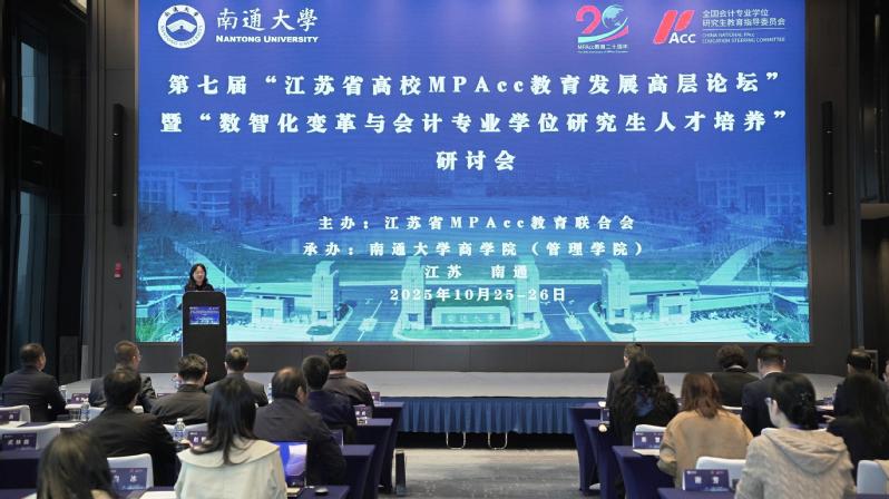 10月25日—26日,由江苏省高校MPAcc教育发展论坛理事会主办、mg冰球官网承办的第七届江苏省高校MPAcc教育发展高层论坛暨数智化变革与会计专业学位研究生人才培养研讨会在南通召开。校长王建浦,江苏省财政厅一级调研员、会计处处长、江苏省会计学会秘书长吴琳,南通市财政局局长曹金海,江苏省MPAcc教育联合会理事长、南京大学教授王跃堂出席开幕式并致辞。