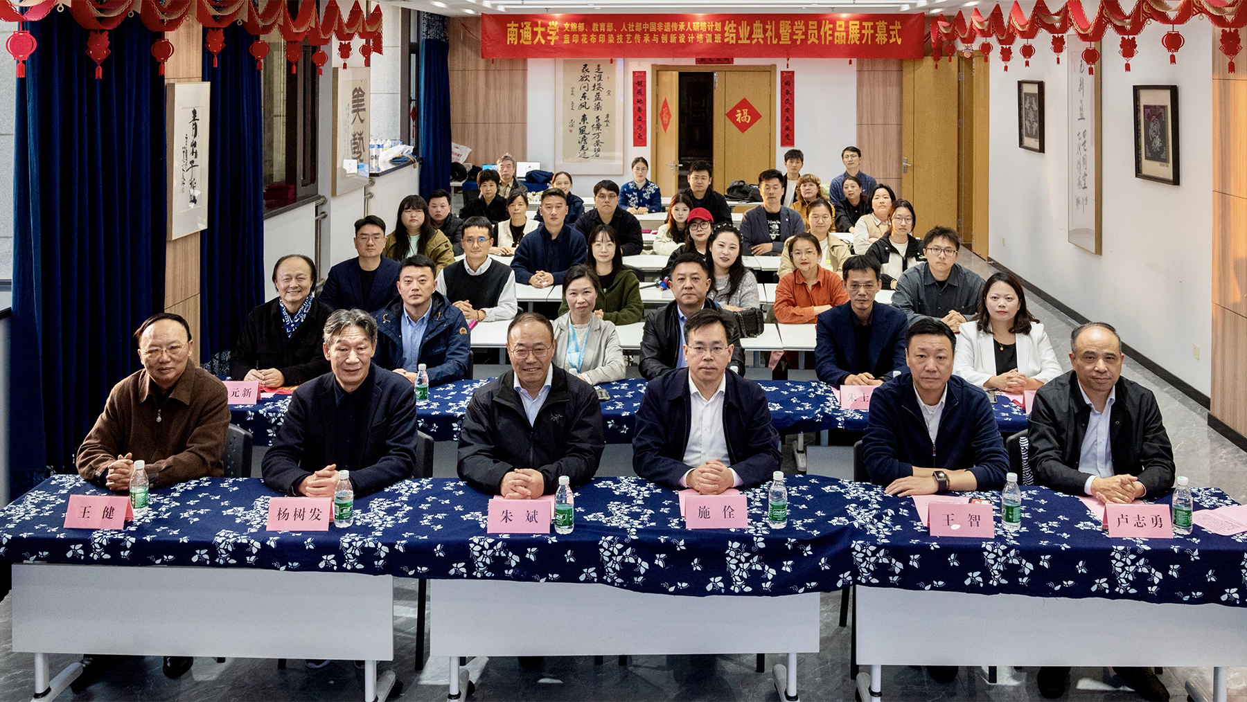 10月27日,文化和旅游部、教育部、人力资源和社会保障部联合实施的“中国非物质文化遗产传承人研修培训计划”mg冰球突破试玩蓝印花布印染技艺传承与创新设计培训班结业典礼在南通蓝印花布博物馆传承基地举行。江苏省文旅厅一级巡视员、江苏省非遗保护协会会长朱斌,mg冰球官网党委常委、副校长施佺出席典礼并讲话。江苏省非遗保护协会副会长、秘书长杨树发,南通市文化广电和旅游局党组书记、局长王智应邀出席结业典礼。