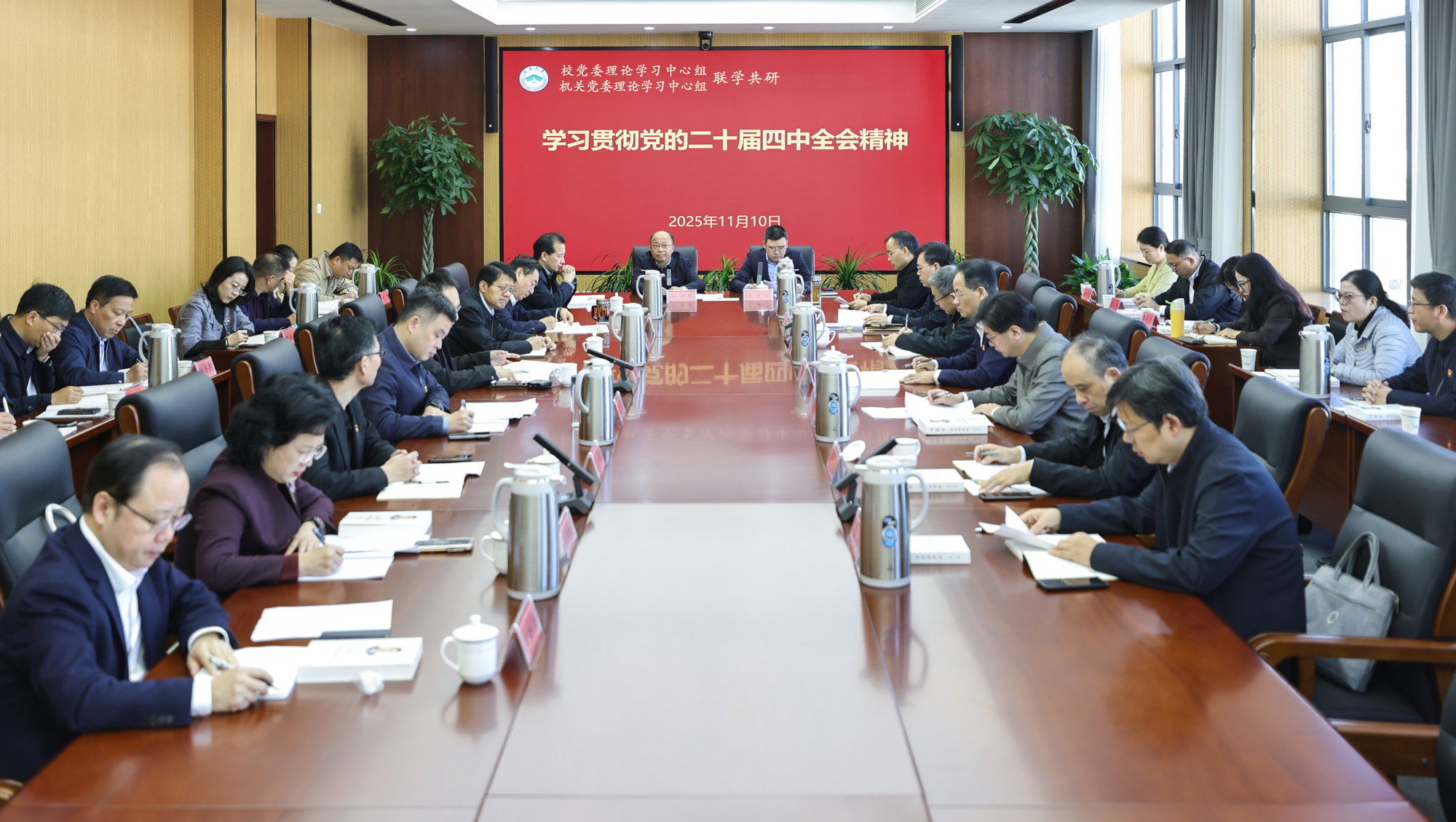 11月10日上午,mg冰球官网召开校党委理论学习中心组学习会,专题学习贯彻党的二十届四中全会精神。校党委书记杨宇民主持会议,就学习宣传贯彻落实全会精神做出工作要求与部署。校长王建浦领学《中共中央关于制定国民经济和社会发展第十五个五年规划的建议》。校党委理论学习中心组、机关党委理论学习中心组全体成员参加学习。