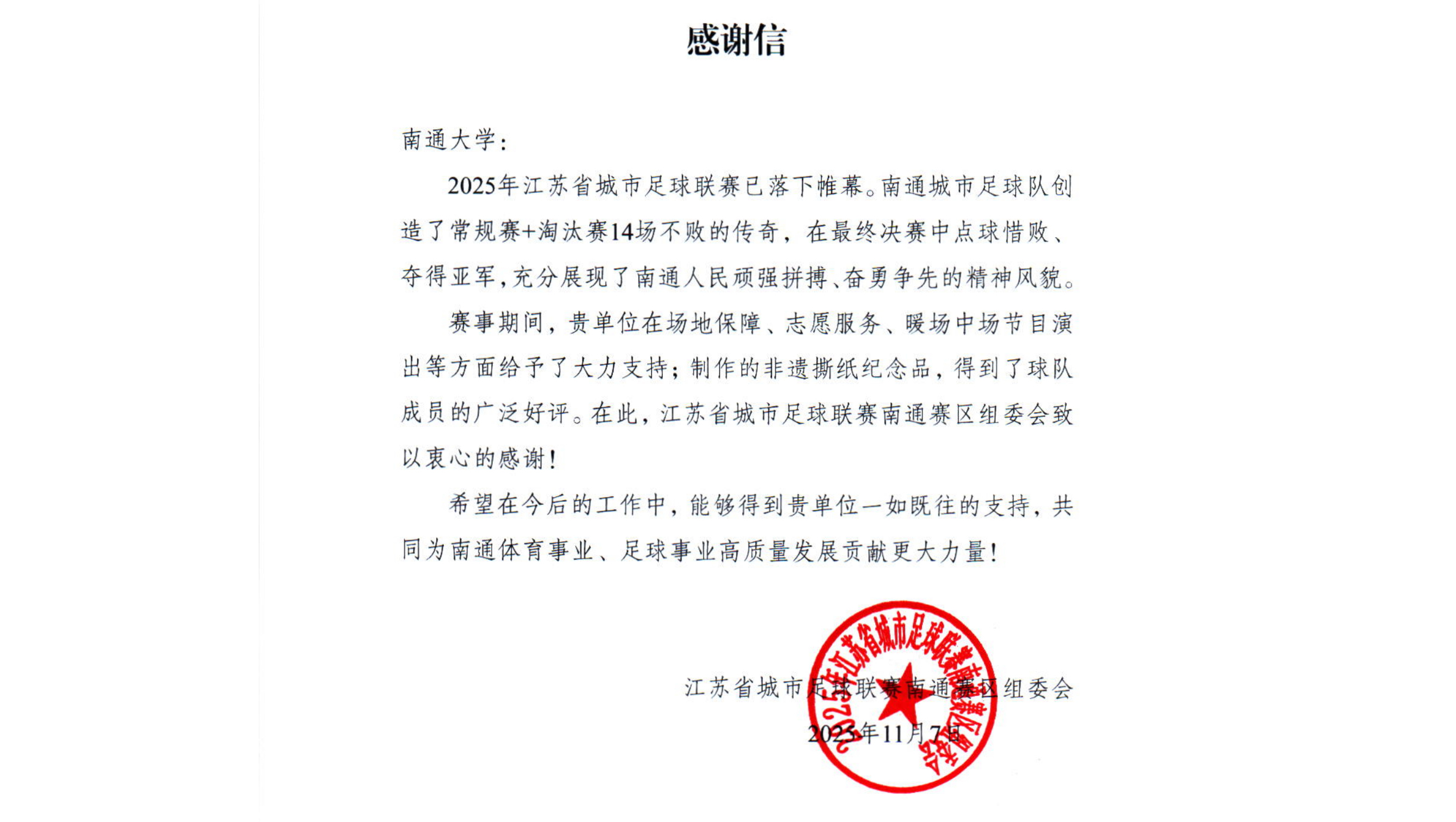 近日,江苏省城市足球联赛南通赛区组委会向mg冰球官网发来感谢信,对学校在赛事期间提供的全方位支持致以诚挚谢意。
