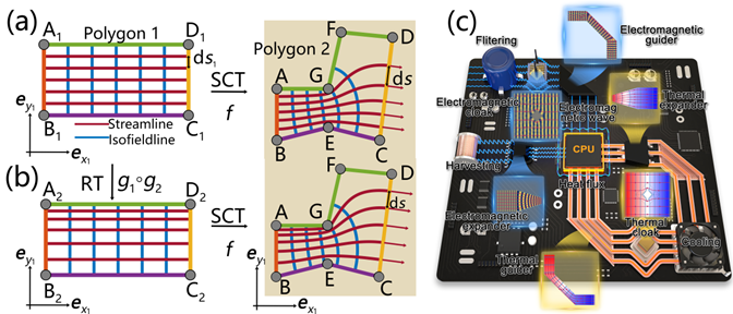 针对上述挑战,该研究提出了一种名为“重标度施瓦茨—克里斯托费尔变换”的半解析理论方法,先通过经典施瓦茨—克里斯托费尔变换对器件复杂多边形几何进行共形映射,引导能流整体走向并保持材料各向同性,然后引入“重标度变换”,对映射后空间网格进行重构,从而在界面处精确调控能流密度分布。这一“几何塑形”与“能流重构”相结合的协同策略,首次仅用各向同性材料便同时在瞬态热场与电磁场中实现了完美的界面匹配。为验证理论的普适性与有效性,研究团队设计并展示了扩展器、引导器及隐身斗篷等多物理场功能器件,成功实现了对热场与电磁场的协同调控。该理论所构建的多边形结构器件与现代印刷电路板上的模块化布局天然兼容,为解决集成电路中热—电磁串扰等实际问题提供了全新途径。该工作是mg冰球突破试玩与复旦大学、上海理工大学等高校合作研究的成果,得到了国家自然科学基金、博士后科学基金和上海市科委等项目的支持。