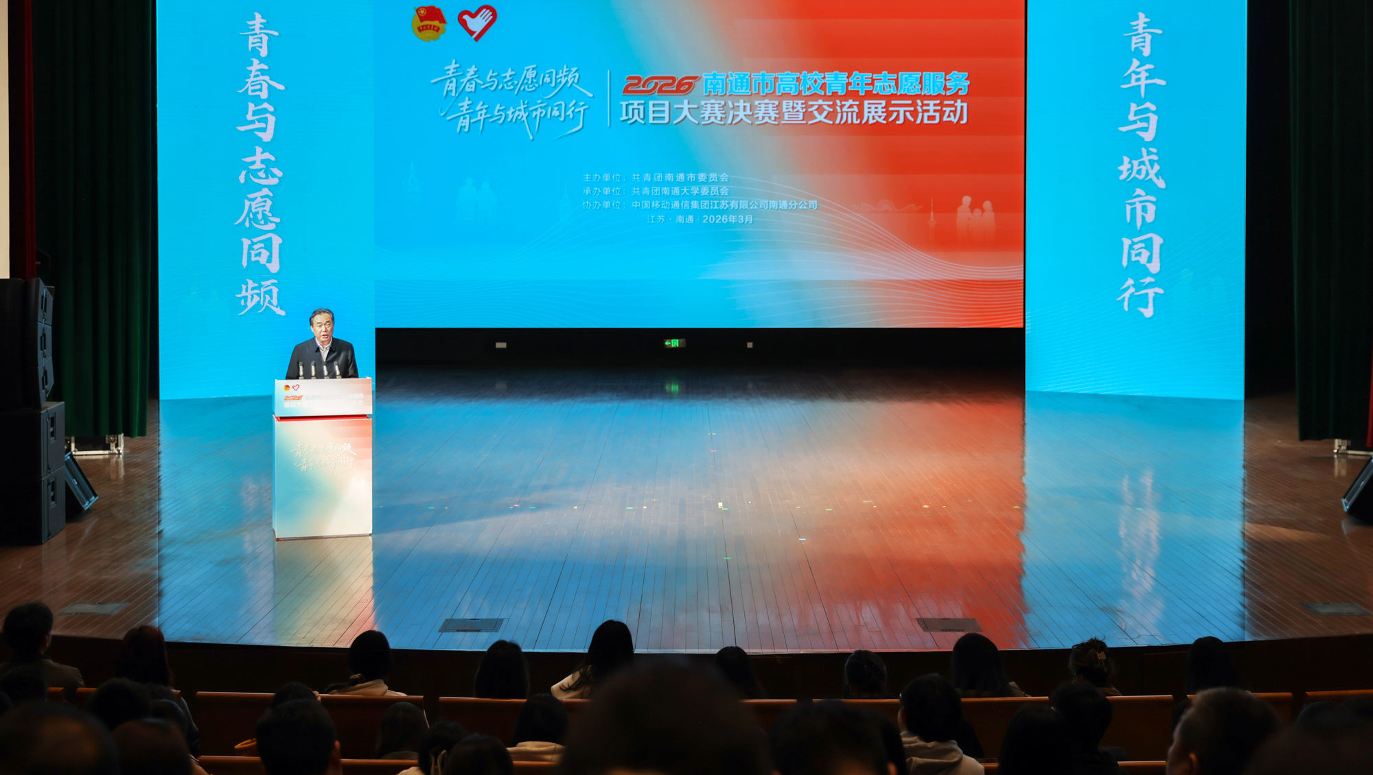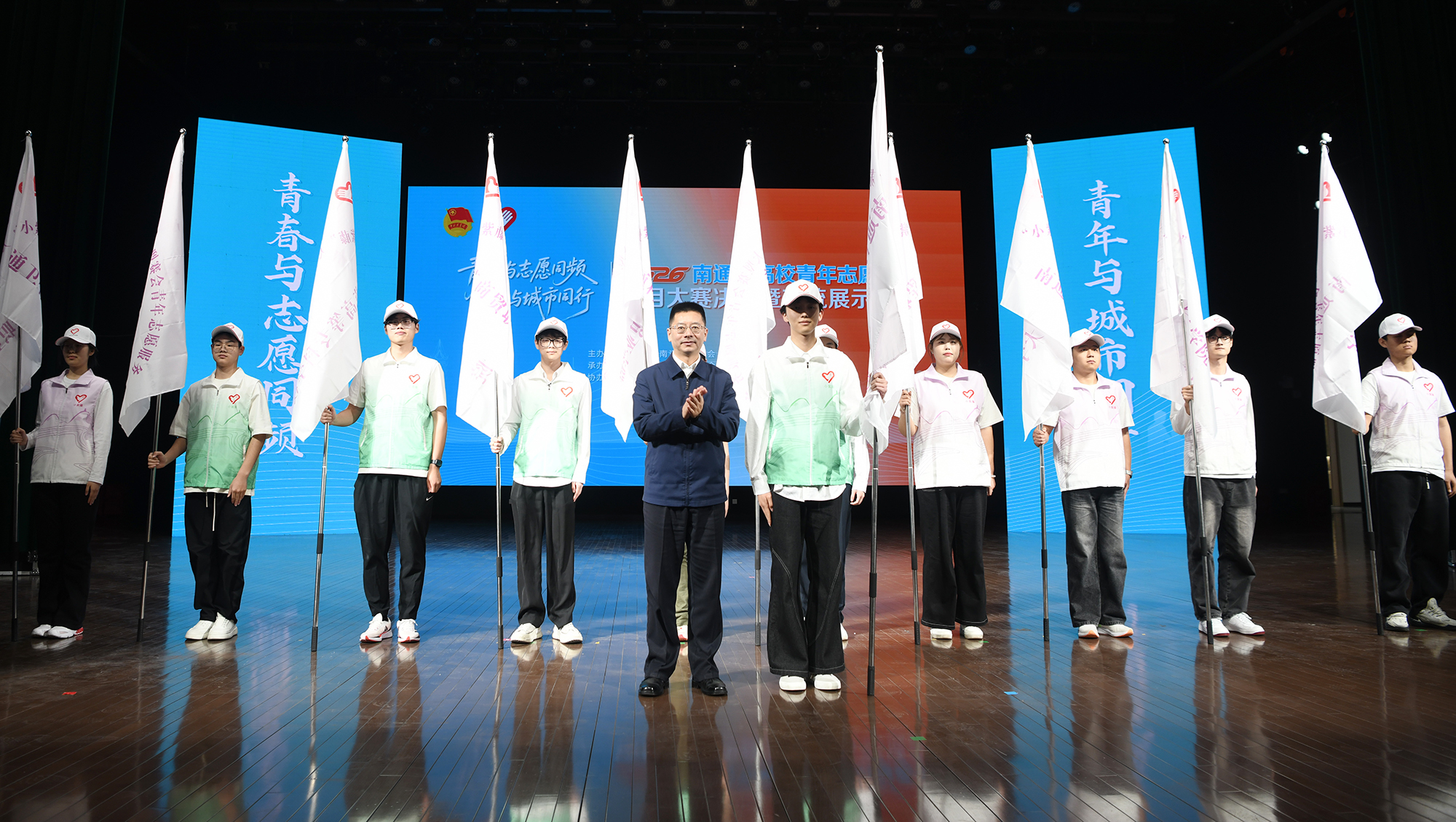 3月26日,2026南通市高校青年志愿服务项目大赛决赛暨项目交流展示活动在mg冰球官网啬园校区举行。现场发布关于大学生参与“垃圾分类”志愿服务的倡议,并举办“小紫藤”苏超志愿者出征仪式。南通市委常委、组织部部长倪春青为“小紫藤”青年志愿服务队授总旗。校党委常委、副校长吉明明代表学校致辞。中国青年报社党委委员、编委兼共青团新闻中心主任黄勇,南通市慈善联合总会副会长顾晓明,南通团市委书记曹铖出席活动。