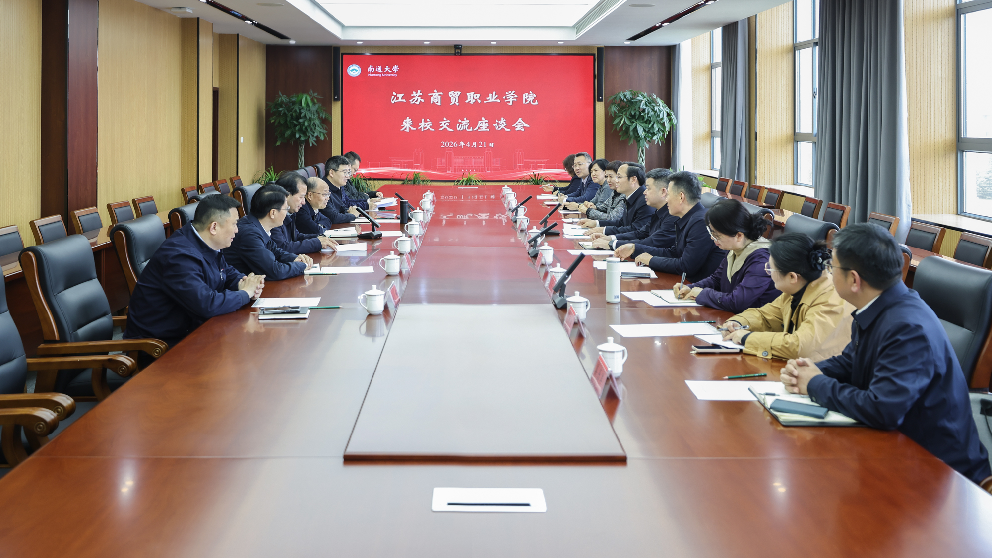 4月21日上午,江苏商贸职业学院党委书记陈祖华,党委副书记、校长陶锋一行来校调研交流。校党委书记杨宇民,校长王建浦,党委副书记王卫东,党委常委、副校长陆俊杰,党委常委、纪委书记、派驻监察专员周振修,党委常委、副校长华亮接待了来宾。