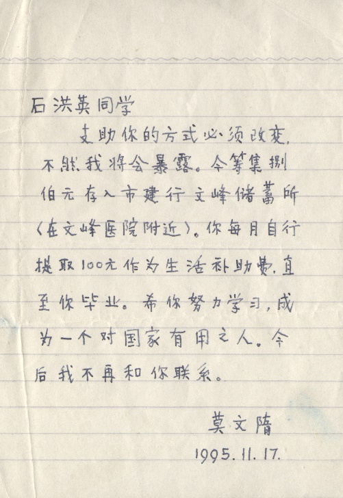 1995年3月,纺织化学工程系染专93级石洪英同学因母亲去世而失去了唯一的生活依靠。回校后,她意外收到一笔汇款,附言:“生活补助费”,地址为南通市工农路“555”号,署名“莫文隋”。从此,石洪英同学每月都会收到一笔汇款。