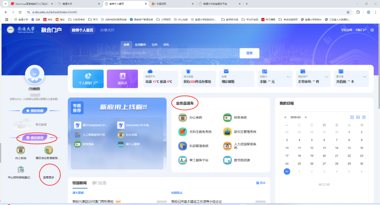 2.在“系统业务直通车”,“查看更多”,“最近应用”等位置点选办公系统、财务系统和学术通知等相关应用。